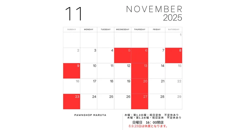 毎週木・第1・2水曜日・祝日定休 不定休あり営業時間:10:00~18:30 日曜日 10:00~16:00第2水曜日(12日)は通常営業いたします。8.9.23日は休業となります。PawnshopMaruya Apple製品