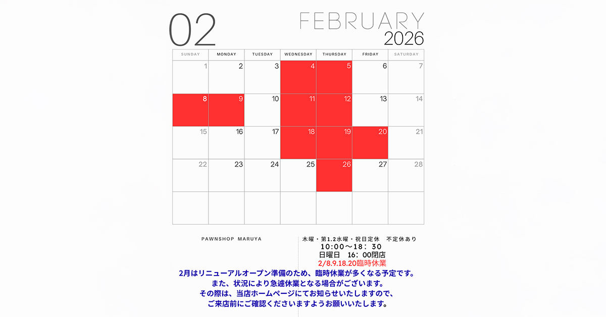 2月はリニューアルオープン準備のため臨時休業が多くなる予定です。